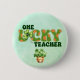 Ce bouton One Lucky Teacher est sur un arrière - plan vert aquarelle et a un motif de pois vert et orange pour les lettres dans Lucky. Il y a un shamrock pour le "U" et un pot de shamrocks aussi.