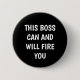 Montrez votre côté amusant avec ce bouton d'Humour Drôle Boss. Il est conçu avec un dicton drôle, "ce patron peut et va vous virer" en gras blanc simple lettrage sur arrière - plan noir. Idée cadeau parfait pour la journée du patron.
