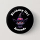 Bouton avec une amusante illustration thématique Halloween pour les amoureux de les chats. Un gros chat noir aux yeux vêtu d'un grand casquette de sorcière noire avec une ceinture rose violet autour du bord.