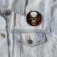 Un insigne/bouton dépeignant un crâne sinistre avec les yeux rouges rougeoyants contre un noir, arrière - plan sang-éclaboussé