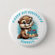 Bleu Otter a thème les boutons de la fête du premier anniversaire du garçon. Mignonne loutre de dessin animé tenant un gâteau d'anniversaire.