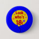 Un ballon jaune, étoiles de confettis, et texte qui lit le "regard qui est 18 !" sur un arrière - plan bleu sur les 18èmes cartes d'anniversaire, boutons, et plus !
