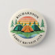 Boutons de camping d'été uniques pour les gardiens de réunion de famille. Le design comprend un coucher de soleil vintage avec trois tentes de camping dans une forêt près d'un lac. Le modèle facilite la personnalisation avec le nom de famille et un an. Ce design est sur un arrière - plan beige.