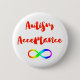 Boutonnez pour le mois d'acceptation d'autisme, avec l'acceptation d'autisme écrite dans les lettres rouges et audacieuses de calligraphie, parce que la conscience n'est pas assez. Sous, le symbole arc-en-ciel-coloré d'infini qui symbolise la diversité de l'autisme.