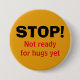 Bouton jaune gamboge moderne avec un message simple qui dit STOP, NOT READY FOR HUGS ENCORE en typographie rouge et noire. Le texte rouge est PERSONNALISABLE, vous pouvez donc créer votre propre message personnel "Keep Away" ! Une façon idéale de résoudre le dilemme de l'accolade ou du coude. Disponible en d'autres couleurs.