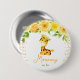 Ce bouton mignon et capricieux peut être personnalisé avec un nom ou un titre, comme maman, grand-mère, nièce, grande soeur etc. Le design se compose d'une adorable girafe avec une couronne de fleurs et des arrangements floraux jaunes avec des confettis de parties scintillant en faux or. Le texte combine écriture manuscrite et polices sans serif pour un look élégant et moderne. Idéal pour un baby shower à thème girafe. Graphiques par heyiamalice et SunflowerDayLove