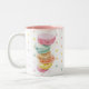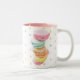 Illustration of a delicately balanced tower of pink, green, orange, brown and yellow macarons. A French specialty and a delicious card or gift for a special friend or anyone who love sweet things.