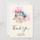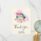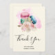 Carte de remerciements avec une image délicieuse. 3 macarons colorés, roses, verts et bleus avec un bouquet floral rose et une petite aquarelle rose derrière. Délicieux et élégant aussi !