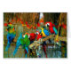 Colourful macaws preening their vivid flamboyant feathers, getting ready for a parade at the state fair.