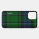 Stylish iPhone case done in the blue and green MacCallum Scottish tartan plaid pattern. White text running vertical down the left side, is ready to personalize for yourself or as a great gift idea. Handsome way to protect your iPhone yet stylish too.