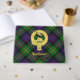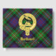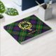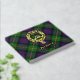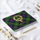 Clan MacDonell of Glengarry crest badge surrounded by a strap and buckle over tartan background. Custom front, back and spine text.