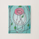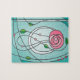 This design is inspired by the art nouveau style of Charles Rennie Mackintosh, finished with a stained glass effect. Lovely shades of blue-green, pink and leaf-greens.