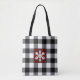 Si vous êtes fou de plaid comme nous, alors vous aimerez ce mélange de noir et blanc et de rouge et de noir sac fourre-tout de motif en plaid Buffalo avec un grand flocon blanc central, parfait pour toute sortie hivernale. Ajoutez votre propre texte si vous le souhaitez.