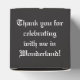 Square classic-style favour box with a vintage Alice in Wonderland image, on the front and back, of the Mad Hatter serving tea to Dormouse with a red border on a black and white Wonderland background. The customizable text on the top reads “Thank you for celebrating with me in Wonderland!" See the entire Wonderland Favour Box collection in the PARTY FAVORS section.