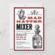 Invitation Mad Hatter Mixer en damier rouge et noir avec illustrations vintages. Customisez ce design en modifiant les détails.