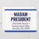 Madam President Kamala Harris. Inauguration Day 2025. January 20, 2025. That's "Madam President" to you. One-design with a blank back side. If you're having problems saying Kamala Harris's first name (it's pronounced "Comma-la"), call her "Madam President" or "Ms. President." Design description: The design area has a white background and a Biden blue border around the edges and Delaware Bay Blue lines at inside edge of the top and bottom borders. All letter text is in a sans serif font in a dark blue Joe Navy border. The first line of text reads, "Madam" with two Honest Red stars on each side. The second line of text reads, "President." Below that is a thin Honest Red line. The bottom of the design area, reads, "Kamala Harris," with a single, angled red star between on each side. Below that, the words over 2 lines, "Inauguration Day 2025, January 20, 2025." Each line of text is a template. Customize with your preferred colours.