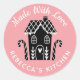 A personalized "made with love" sticker featuring a cute little gingerbread house with a heart and the words, made with love on a pink coloured background. Personalize it by adding your own name. A pretty finishing touch for all of your homemade gifts. Designed for you by Blackberry Boulevard.