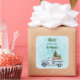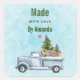 Made with love personalized stickers with a festive holiday design. A truck carrying Christmas pine trees along with some woodland animals. A bear a fox and a deer standing in the back going for a ride. Design created with watercolors.