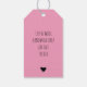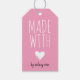 Pink hang tags for your handmade items where you can add your name and washing instructions. Made with love is written in a large hand-written font where a doodled white heart replaces the word love. Your name in a charming black script.