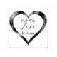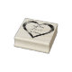 This custom stamp features a heart frame with the phrase Made with Love printed in the centre, followed by a sample name. Love is in a script, handwritten font.