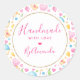 Made with love personalized stickers with a delicious and whimsical pattern. Hearts, love letters, muffins, tulips and cherries bring joy and happiness to this cute little pattern. Pretty pastel colours. A white circle with a faux gold foil border layered over top with your text inside.