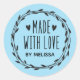 A personalized "made with love" sticker on a light blue background surrounded by a laurel wreath. Make it yours by adding your own name. A pretty finishing touch for all of your handmade gifts. Designed for you by Blackberry Boulevard.