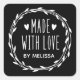 A personalized "made with love" sticker on a black background. Made with love and your name are surrounded by a laurel wreath. Make it yours by adding your own name. A pretty finishing touch for all of your handmade gifts or craft business. Designed for you by Blackberry Boulevard.