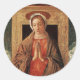 This is a beautiful depiction of the Virgin Mary holding her hands together in prayer. She has a halo and clouds can be seen behind her.