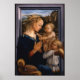This painting is on display in the Uffizi Museum. It shows a praying Virgin Mary. Two angels are holding the child Jesus in front of Mary. Mary and Jesus both seem to be lost in their thoughts. Mary is depicted in a very elegant way compared to earlier paintings. For example, look at her sweet facial expression and the graceful veils and pearls in her hair. Notice also the halo above the heads of Mary and Jesus. These halos are just a simple circle and mark the transition between the solid gold disks used in earlier work and the disappearance of the halo in later Renaissance paintings. The angel on the right seems to giggle and watch the viewer directly in the eyes. Mary, Jesus, and the angels are depicted in front of a window, which can easily be mistaken for the frame of this painting. In the background, you can see a landscape inspired by Flemish paintings.