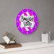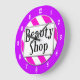 Une horloge murale unique lisant Beauty Shop en lettres rétro avec arrière - plan rayé rose et blanc entouré de chiffres blancs sur violet. Cliquez sur Customiser pour modifier les couleurs des arrière - plans et plus encore.