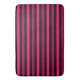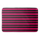 This bath mat features a horizontal striped pattern in magenta pink and black.