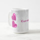 Enjoy your morning coffee with a Magenta Hearts Personalized Coffee Mug. Mug design features a a pair of hearts, a soft white leafy vine against a light grey grunge background with an area to personalize with your name. Additional gift items available with this design as well as a variety of colours.