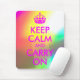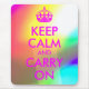 Magenta "Keep Calm and Carry On" against a colourful abstract background.