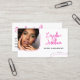 Minimalist photo business card with retro lines in magenta and black against a white background and your name in a rough signature script. Personalize with your photo and a QR code. Influencer QR code business card in white with magenta details and your photo.