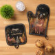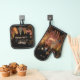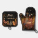 Each piece features a delightful, cohesive design on a rich black background, illuminated by golden glows and shimmering stars. The oven mitt showcases a majestic deer amidst glowing Christmas trees, with a watchful owl perched nearby. The coordinating pot holder highlights a playful squirrel, nestled among the glowing trees, along with the inspiring golden script: 'Magic happens in the kitchen'.