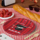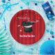 A graphic illustration of a magician’s hat with a red curtain background by artist/designer Charmaine Paulson on party plates. The plates have templates for your personalization.