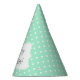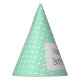 Magic mint and white polka dot pattern birthday party paper hats. The design features a white polka dot pattern on mint green and a white shape in the middle with your custom text.