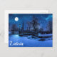 Snowy park with beautiful bridge over small pond, street light and covered in snow trees in winter in night. Beautiful winter night