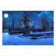 Snowy park with beautiful bridge over small pond, street light and covered in snow trees in winter in night. Beautiful winter night.