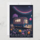 Whimsical greeting card for book lovers features AI generated digital art dreamscape with a illuminated bookmobile in a field of flowers under a night sky. "Meet me under the stars and we can read all our favourite banned books together" text can be customized to your own special message