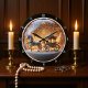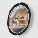 This enchanting round graphic captures a magical Christmas scene. A beautiful white horse pulls an elegant, decorated carriage through a snowy landscape filled with illuminated pine trees and twinkling lights. The entire scene creating a truly festive and fairytale-like holiday decoration.