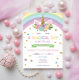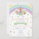 This is a unicorn and rainbow themed birthday party invitation.
