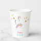 Cute personalized unicorn birthday party paper cups. This fun custom design features a sweet unicorn illustration, stars and a rainbow. Trendy pink, purple, blue and yellow colours with a touch of faux gold glitter.