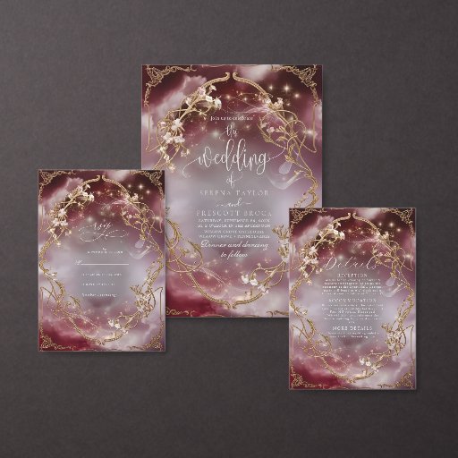 Magical Rose Gold Ornate Baroque : An exquisite and luxurious wedding invitation design, featuring a floral motifs, intricately intertwined with gold accents, gracefully dance across the card. These floral elements mingle with the sparkling lights, inviting guests to a majestic celebration of love and union. The invitation promises an unforgettable experience, where guests will be immersed in the opulence of a regal affair, surrounded by the splendour of a lavish and enchanting wedding.