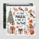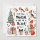 An adorable Christmas-themed design featuring cute woodland animals—foxes and festive birds—dressed in cozy winter scarves and surrounded by holiday presents. The soft colour palette of red, white, and grey, paired with decorated Christmas trees, stars, and delicate floral elements, brings a Scandinavian-inspired charm. The "It's that Magical time of the year" message completes this heartwarming, whimsical holiday scene, perfect for cards and seasonal decor.