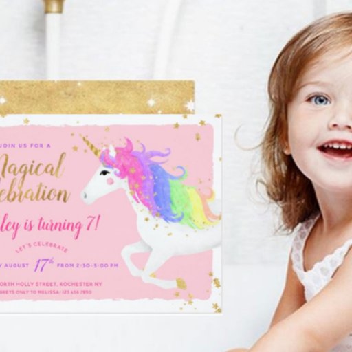 Unicorn birthday invitations with gold glitter stars and magical rainbow colours! Text in gold and pink, with a white and gold unicorn and rainbow against a soft pink background.