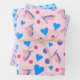 Wrapping paper sheets feature an original marker illustration of hearts and unicorns in blue, pink and purple.