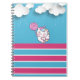 This design shows a happy unicorn holding a big lollipop, flying under white clouds with a colourful spriped background