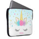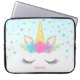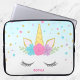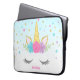 Sweet unicorn face custom laptop sleeve. Design features pink, purple, teal stars and flowers, with a touch of faux glitter.