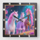 This enchanting wall clock features three whimsical unicorn-like creatures with vibrant pink manes, set in a mystical, colourful forest. With its bright hues and fantastical elements, this timepiece adds a touch of magic and charm to any room. Perfect for children's decor or for anyone who loves whimsical and imaginative art.